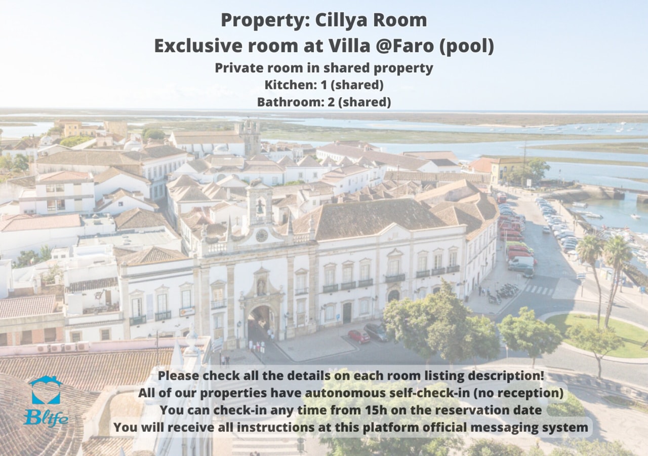 We are BLife Rentals and all our properties have self-check-in with safes, you can enter at any time within your reservation :) Click "show more" for all other details. Room in an amazing Villa with a swimming pool and a huge backyard. There are supermarkets and restaurants nearby. It is on the outskirts of Faro, ideal for those with a car (and you can park your car inside the property). *MOUSTACHYA*